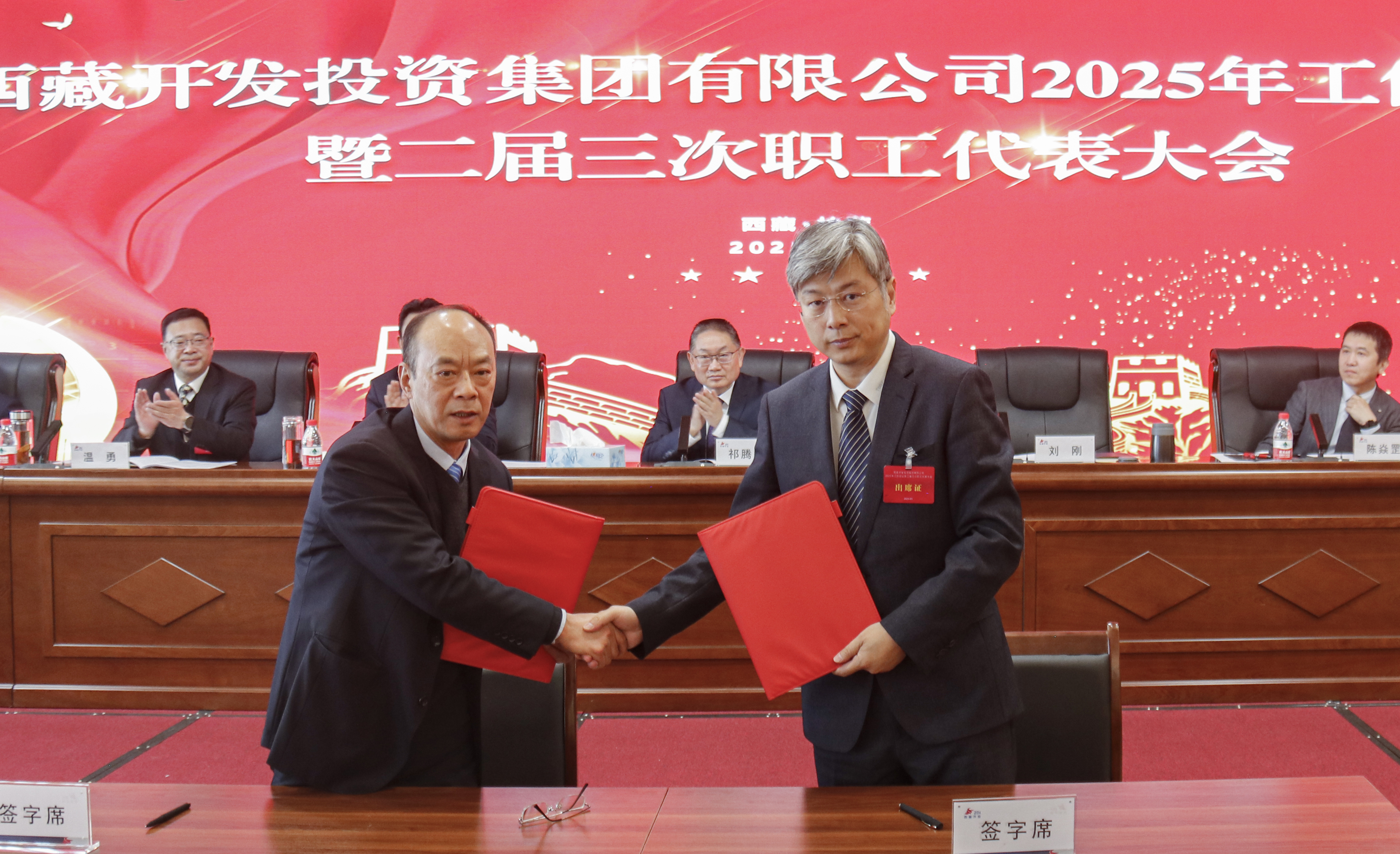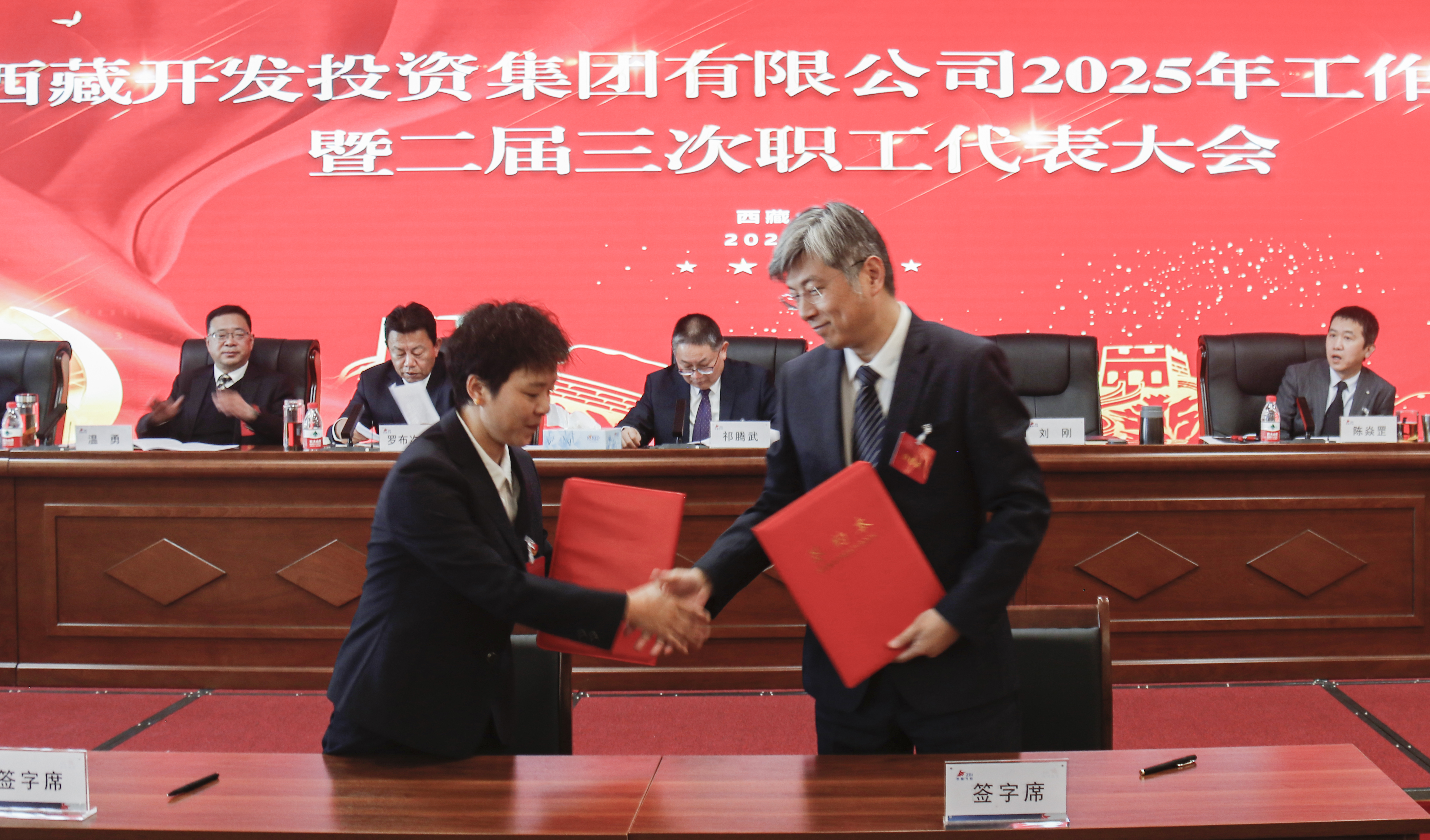 會(huì)上,集團(tuán)管理方首席代表劉剛與集團(tuán)職工方首席代表羅布次仁簽訂了《集體合同》及附屬專項(xiàng)集體合同。并代表集團(tuán)與各部門(mén)、各單位代表簽訂了今年的目標(biāo)責(zé)任書(shū)。