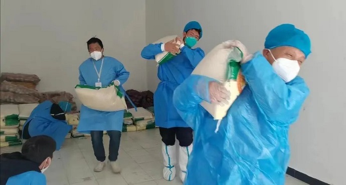 還來不及調(diào)整夜班后的身體疲倦,次日中午時分,志愿服務(wù)隊就收到了社區(qū)進(jìn)行國慶政府慰問物資配送的通知。為保證社區(qū)居民能享受到最新鮮、及時的慰問物資,隊員們重打前一晚的雞血,頂著淅淅瀝瀝的小雨和感冒被感染的風(fēng)險,再次手抓肩扛,將包裝完好的合計約5噸的糧油水果送到了居民手中。匆忙的腳步、簡單的交流,也讓社區(qū)百姓們漸漸讀懂了志愿服務(wù)隊的初心。