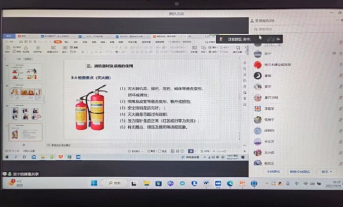 11月11日,油氣管道分公司組織開展消防安全知識線上專題學(xué)習(xí)會。會議傳達學(xué)習(xí)了西藏自治區(qū)國資委關(guān)于轉(zhuǎn)發(fā)《2022年“119”消防宣傳月活動方案》的通知和《消防安全基礎(chǔ)知識培訓(xùn)手冊》,觀看了《2022年近期住宅小區(qū)消防安全警示片》。