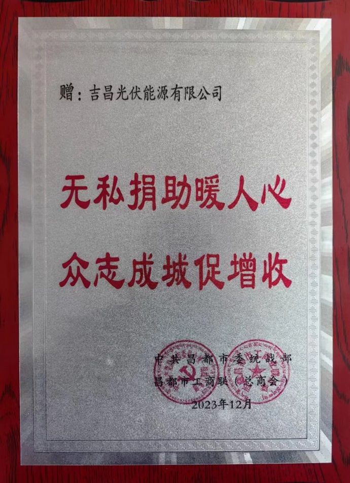 4月26日,中共昌都市委統(tǒng)戰(zhàn)部、昌都市工商聯(lián)(總商會)聯(lián)合授予西藏開投吉昌光伏能源有限公司“無私捐助暖人心 眾志成城促增收”榮譽(yù)獎牌,對公司充分發(fā)揮典型示范帶動效應(yīng),有效增強(qiáng)“萬企興萬村”促增收、“百企幫百戶”等活動影響力和凝聚力,為昌都市鄉(xiāng)村振興貢獻(xiàn)企業(yè)力量予以肯定和鼓勵?!?/div>