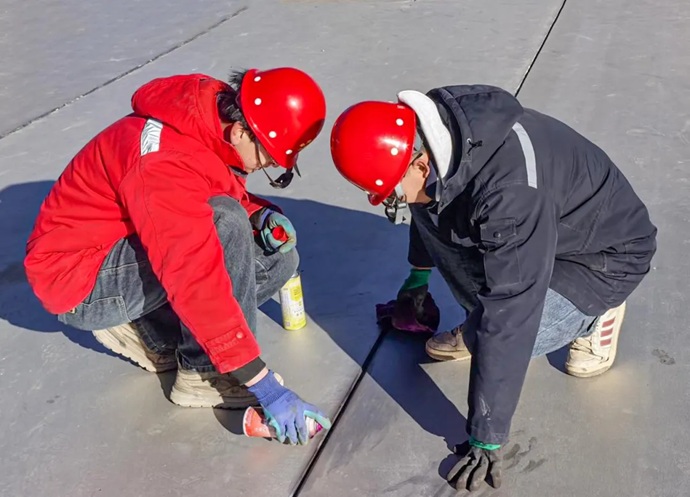 現(xiàn)場工人進(jìn)行金屬板材接縫處理。