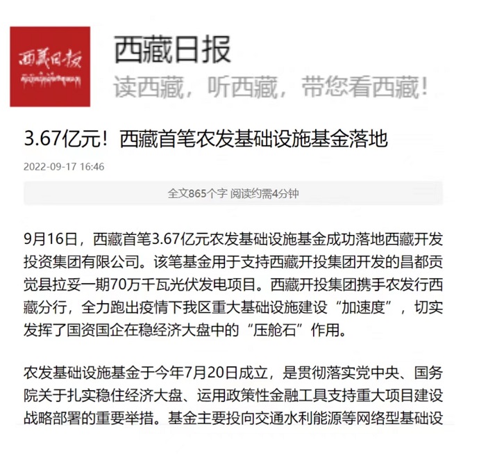 (編者按)《西藏日?qǐng)?bào)》2022年9月17日?qǐng)?bào)道西藏首筆農(nóng)發(fā)基礎(chǔ)設(shè)施基金落地西藏開投集團(tuán)。全文如下: