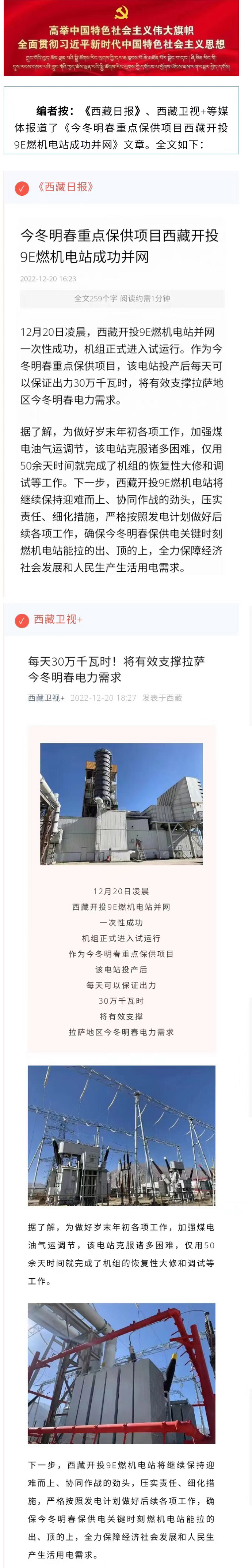 《西藏日報(bào)》、西藏衛(wèi)視+報(bào)道今冬明春重點(diǎn)保供項(xiàng)目西藏開投9E燃機(jī)電站成功并網(wǎng)