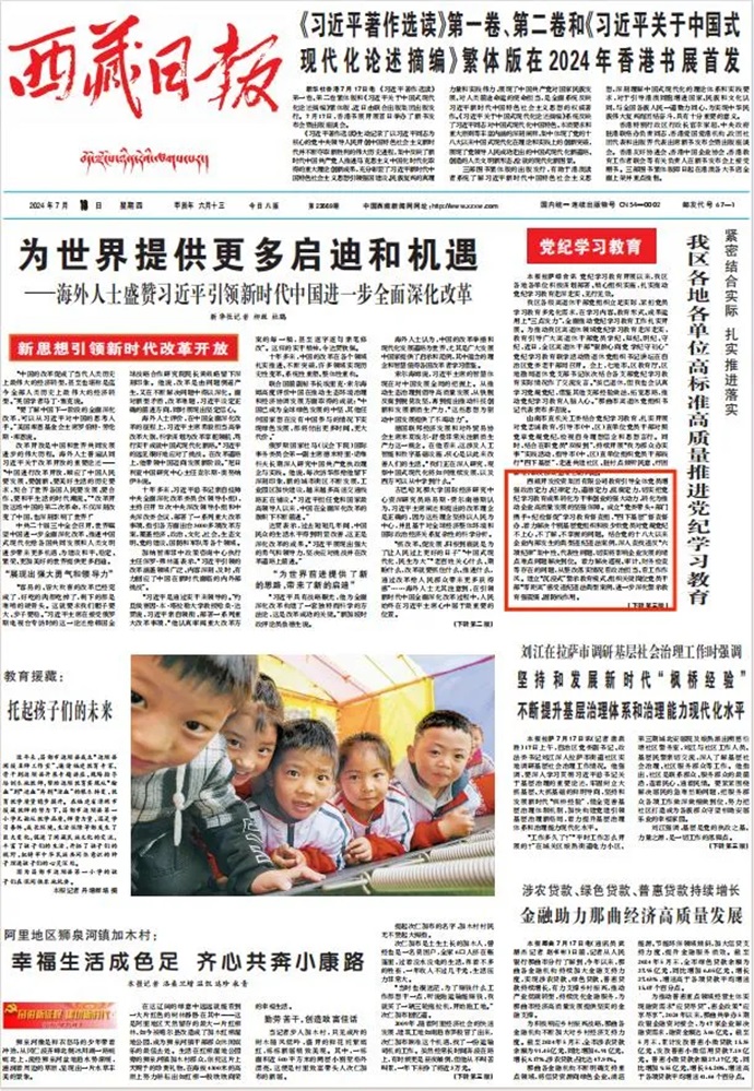 編者按:7月18日,西藏日報報道了《緊密結(jié)合實際 扎實推進(jìn)落實 我區(qū)各地各單位高標(biāo)準(zhǔn)高質(zhì)量推進(jìn)黨紀(jì)學(xué)習(xí)教育》文章。摘要如下: