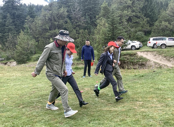 座談結(jié)束后,全體黨員面向黨旗莊嚴(yán)宣誓,重溫入黨誓詞,激勵(lì)永葆入黨初心。最后,兩支部開展了以“重溫紅色”為主題的戶外團(tuán)建活動(dòng),通過重走長征路、黨建知識問答、紅色詞匯你比我猜、兩人三足等活動(dòng)進(jìn)一步增進(jìn)支部交流互動(dòng)。活動(dòng)現(xiàn)場,參賽隊(duì)員充分發(fā)揚(yáng)團(tuán)隊(duì)精神,積極參與,精誠合作,加油聲、吶喊聲、歡呼聲此起彼伏。