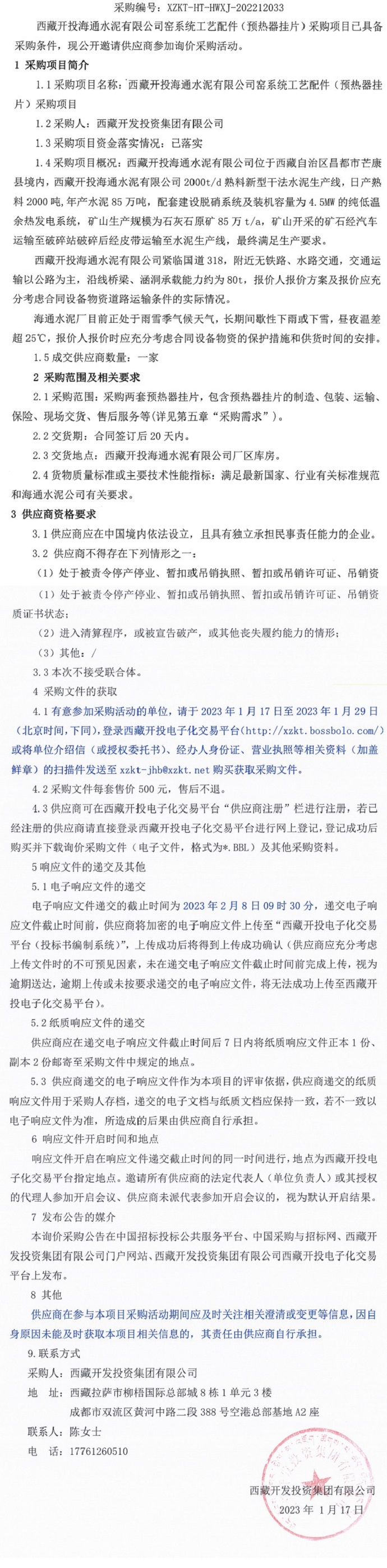 西藏開投海通水泥有限公司窯系統(tǒng)工藝配件(預(yù)熱器掛片)采購項(xiàng)目詢價(jià)采購公告