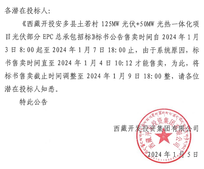 關(guān)于延長(zhǎng)《西藏開(kāi)投安多縣土若村125MW光伏+50MW光熱一體化項(xiàng)目光伏部分EPC總承包招標(biāo)》標(biāo)書(shū)售賣時(shí)間的公告