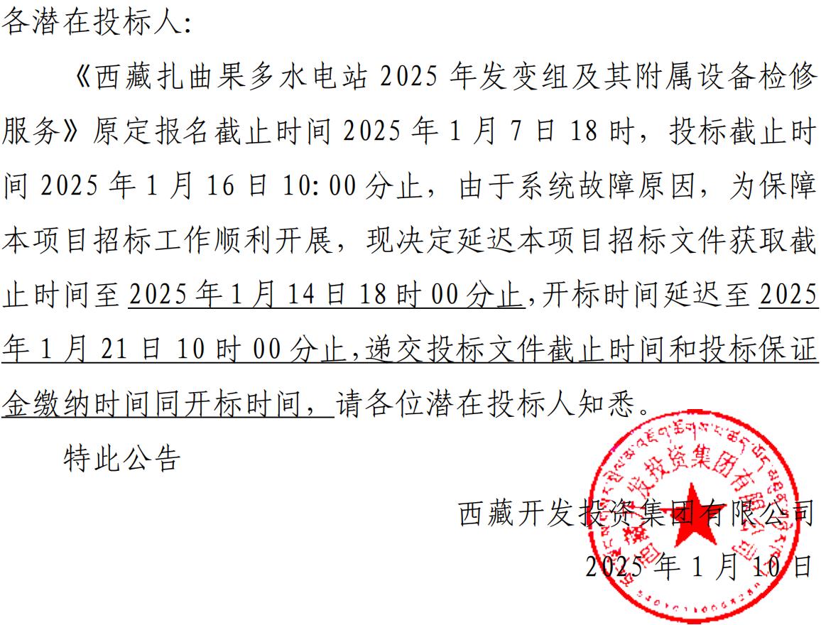 關于延長《西藏扎曲果多水電站 2025 年發(fā)變組及其附屬設備檢修服務》報名及投標截止時間的公告