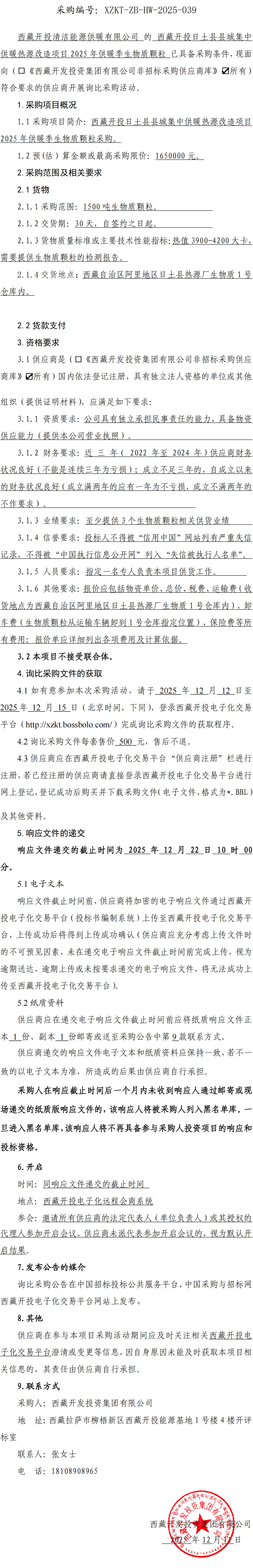 西藏開投日土縣縣城集中供暖熱源改造項目2025年供暖季生物質顆粒詢比采購公告